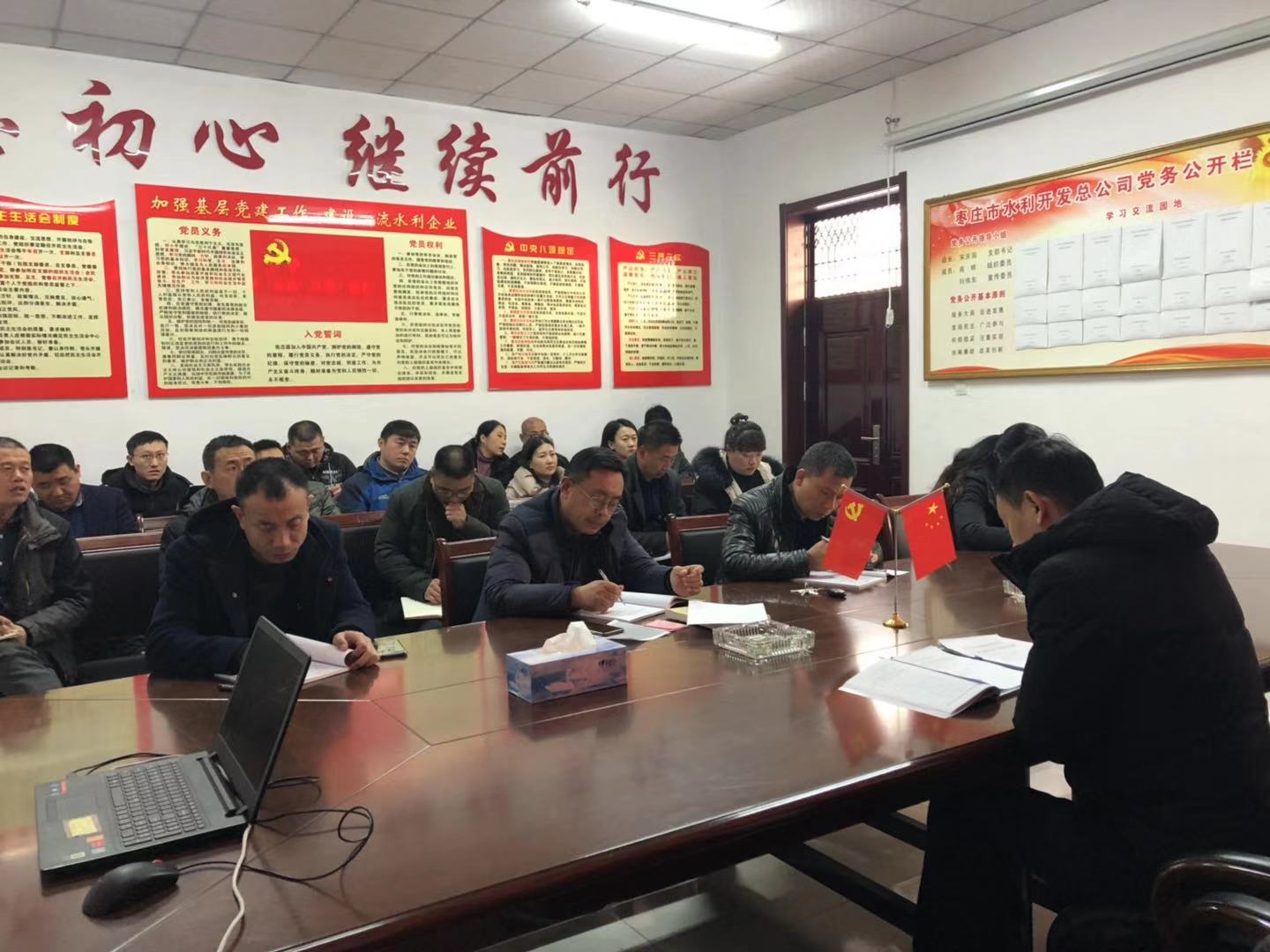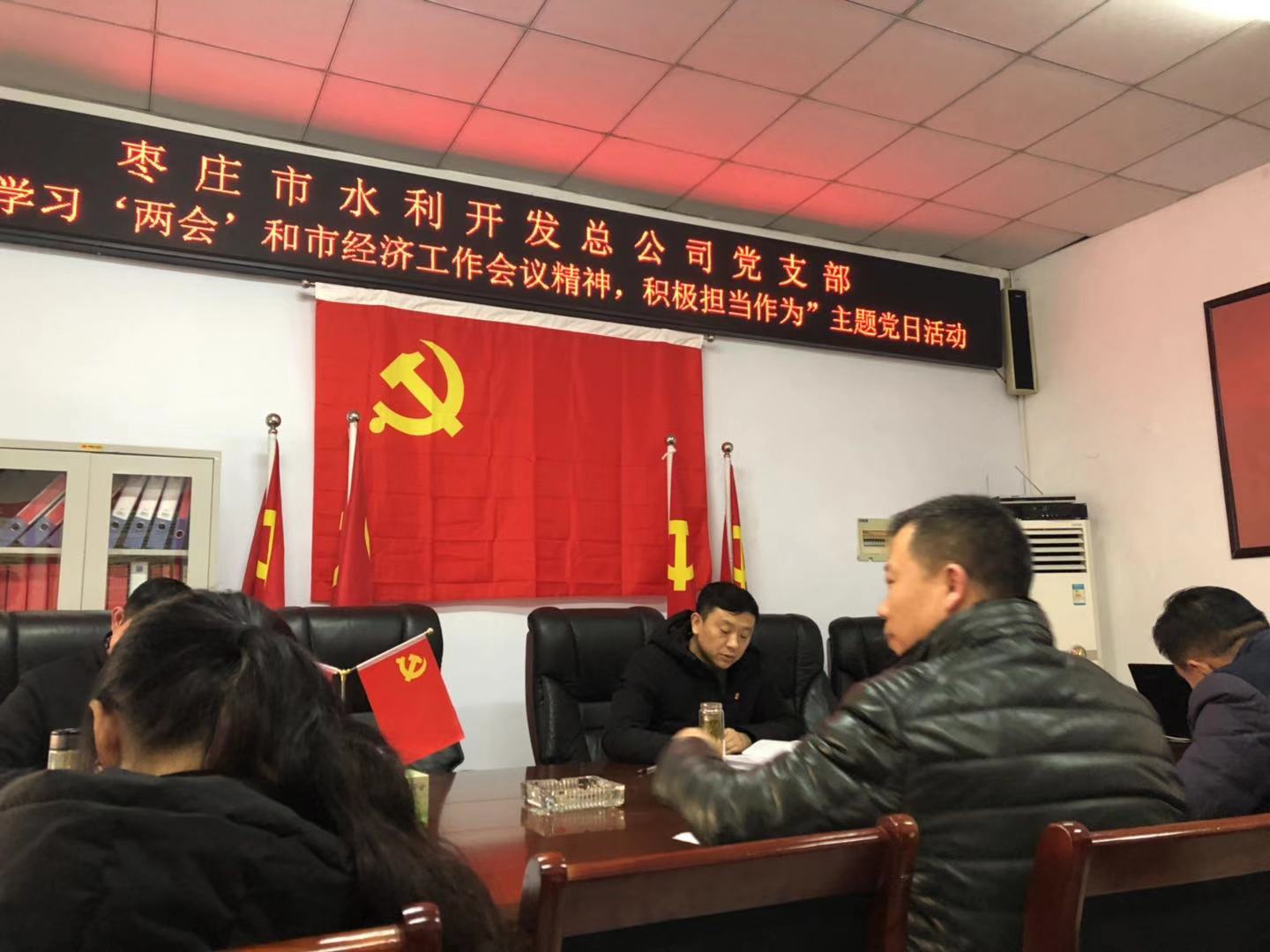 為深入學(xué)習(xí)市“兩會(huì)”和市經(jīng)濟(jì)工作會(huì)議精神,切實(shí)將思想和行動(dòng)統(tǒng)一到以習(xí)近平同志為核心的黨中央決策部署上來(lái)。2019年1月28日下午,棗莊市水利開發(fā)總公司黨支部開展“學(xué)習(xí)市‘兩會(huì)’和市經(jīng)濟(jì)工作會(huì)議精神,積極擔(dān)當(dāng)作為”主題黨日活動(dòng)。