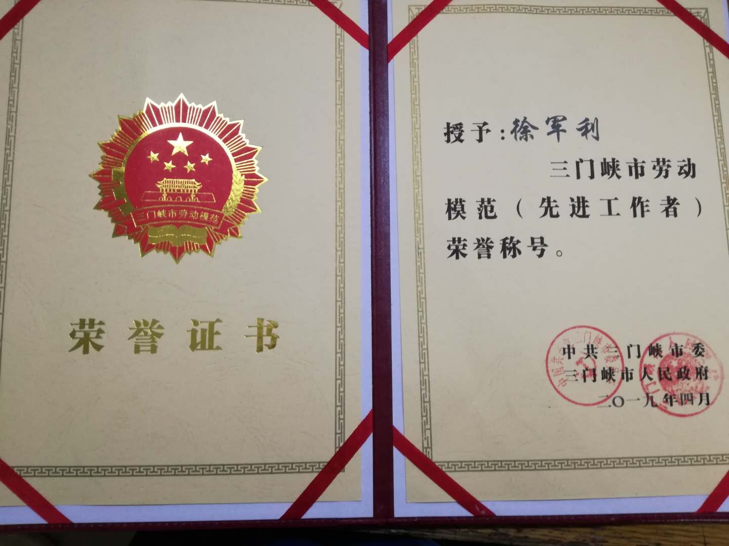熱烈祝賀昊博公司徐軍利同志獲得“三門峽市勞動模范”榮譽稱號